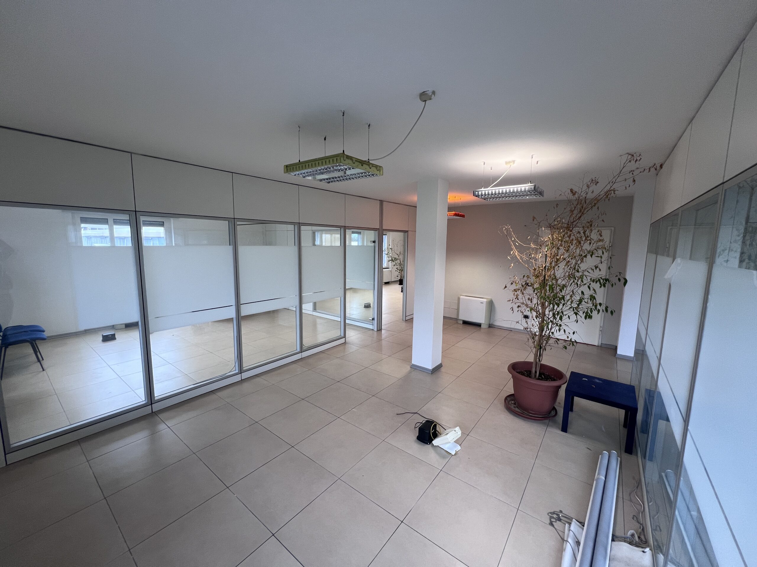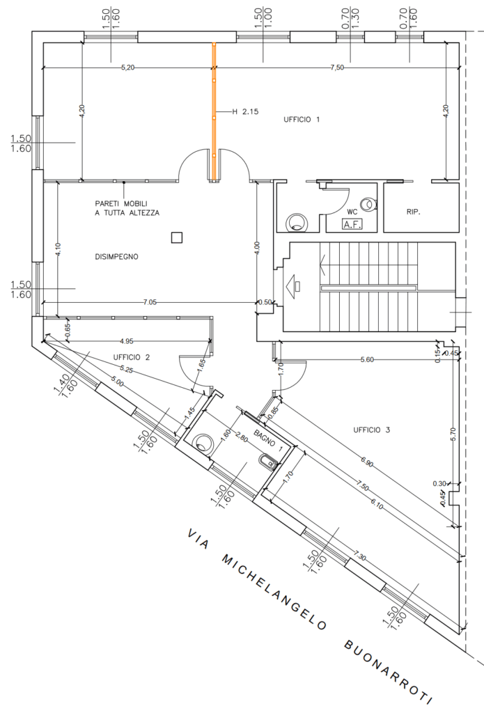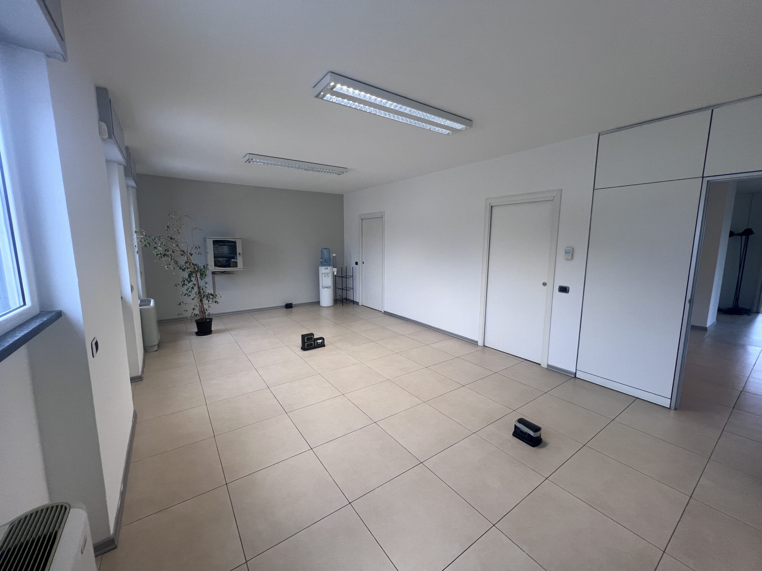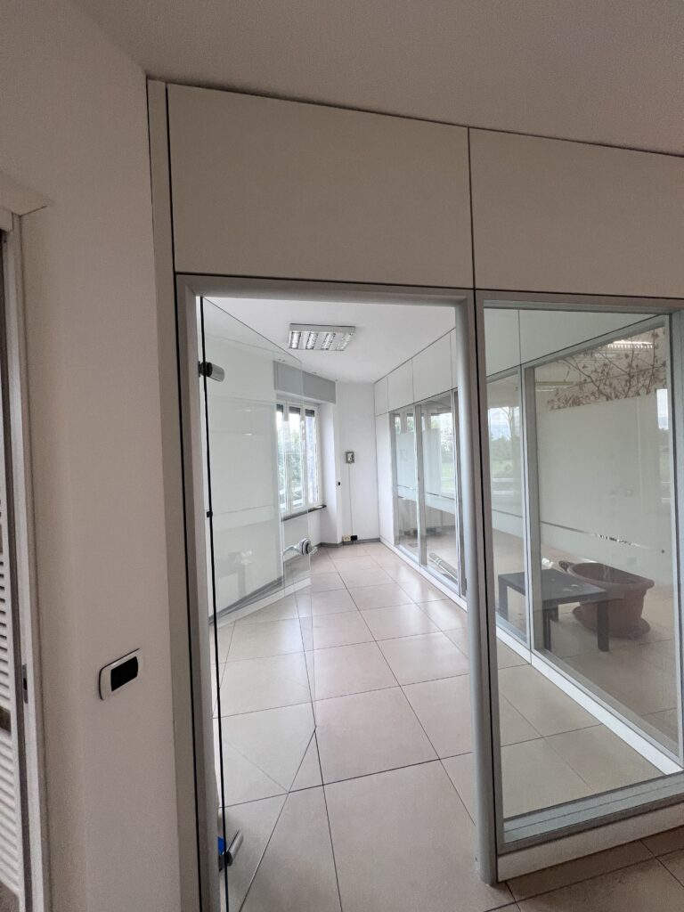 Grazie alle pareti mobili divisorie e al pavimento tecnico galleggiante è possibile personalizzare l’ampio open space modificando gli attuali 5 vani.